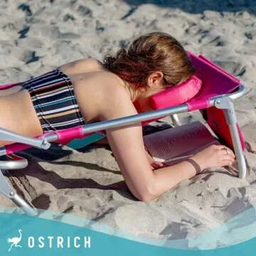 Show moreExperience unparalleled relaxation with the Ostrich Ladies Comfort & On-Your-Back Lightweight Beach Reclining Lawn Chair. This versatile outdoor seating solution is not just a chair; it transforms any environment into a personal oasis, whether you're at the beach, lounging by the pool, or soaking up the sun in your backyard. Designed specifically with women's comfort in mind, this innovative chair features a unique, patent-pending expandable chest cavity that adjusts to provide optimal support while you unwind in the prone position. With its stylish pink design, you'll feel chic while maximizing your comfort.
