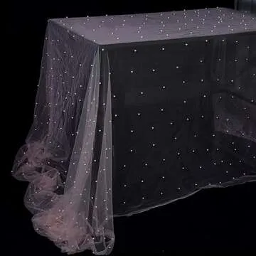 OSVINO Pink Pearl Wedding Arch Decorations Romantic Bridal Veil Lace Fabrics Dessert Table Cloth 63x120 inches Long Beaded Tulle Chiffon Tablecloth Bridal Shower Holiday Birthday Party Table Decor