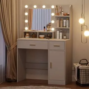 OTDMEL Makeup Vanity Desk, Vanity Table with Mirror & Lights, 35" W Vanity Set with 2 Drawers & Shelves Cabinet,3 Color Modes & Adjustable Brightness Dressing Table for Bedroom, White