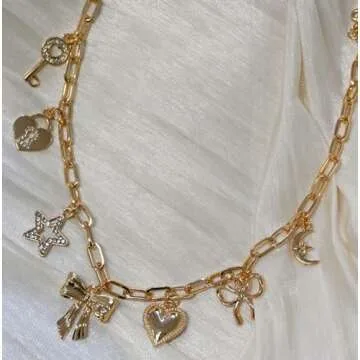 Show more Introducing the exquisite design of our chunky gold charm necklace, tailored specifically for the modern woman who embraces style and individuality. This stunning piece features a mesmerizing combination of whimsical charms, including delightful bows and charming stars, reflecting the aesthetic of 2000s Y2K fashion. With an adjustable chain measuring 15+3 inches, this necklace fits virtually any neckline, making it the perfect addition to your jewelry collection.
