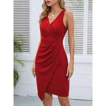 oten Women V Neck Asymmetrical Bodycon Semi Formal Party Dresses Sleeveless Ruched Knee Length Cocktail Short Dress with Irregular Hem Red M