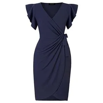 oten Women V Neck Ruched Wrap Dress Knee Length Work Business Sheath Party Dresses with Ruffle Sleeves Navy Blue Large