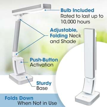 Show moreIlluminate your space and your creativity with the OttLite 13W Slimline Desk Lamp. Designed for ultimate versatility and ease of use, this lamp is perfect for any home, office, or reading nook. Its compact design allows for space-saving storage, effortlessly folding away when not in use. The sleek white finish complements any decor style, while the efficient LED bulb provides bright, natural daylight illumination. Say goodbye to eye strain and hello to productivity as you enjoy optimal brightness tailored to your tasks.