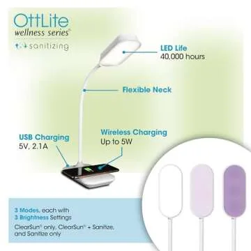 OttLite Achieve LED Sanitizing Desk Lamp Wireless Charging and USB Charging - Touch Activated, Flexible Neck, Modern Light for Reading, Crafting & Office Desktop