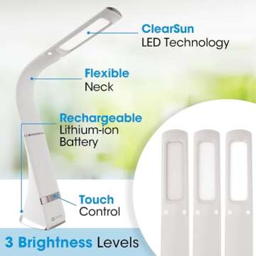 Show moreIlluminate your space with the cutting-edge OttLite Recharge LED Desk Lamp featuring innovative ClearSun LED Technology. Perfect for your kitchen island, office desk, or bedside table, this lamp combines style and functionality. With its sleek white design and flexible gooseneck, effortlessly position the light where you need it most—whether that’s illuminating your latest book or enhancing your workspace. The height adjustment feature allows it to extend from 10 to 18.75 inches, making it versatile enough to fit any setting. The compact base of 2.65 x 3.625 inches ensures it won’t take up too much desk space while providing the natural light needed for all tasks, big and small.