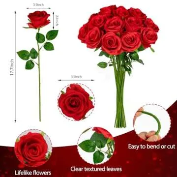 Show moreBring the beauty of nature indoors with our exquisite selection of artificial red roses, crafted to perfection and ideal for all your decorative needs. This package includes 20 stunning fake roses, each adorned with realistic green leaves, making these an excellent choice for anyone looking to add a pop of color and elegance to their surroundings. Each rose boasts a diameter of 3.9 inches and a total length of 17.7 inches, making them versatile for various arrangements, from vases to bouquets.