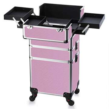 OUDMAY Makeup Case - 3 In 1 Aluminum Professional Rolling Cosmetic Beauty Storage With Folding Trays and Large Compartments Pink