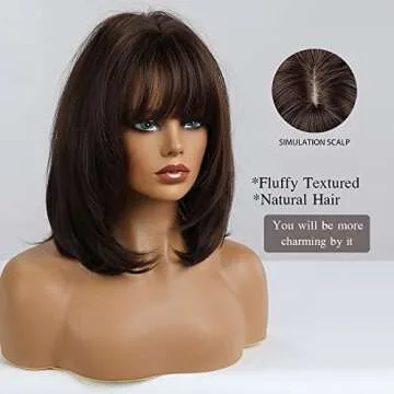 OUFEI 14 Inches Short Dark Brown Bob Wigs Straight with Bangs Slightly Curved Hair Ends Synthetic Hair Cosplay Daily Party Wig for Women Natural As Real Hair (Free Wig Cap)…