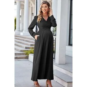 OUGES Fall Maternity Maxi Dresses Long Sleeve Wrap V Neck Baby Shower Dress Maternity Clothes 2025(Black,XL)