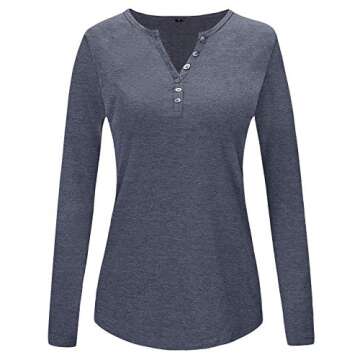 OUGES Womens Long Sleeve V-Neck Button Henley Tops Business Dressy Casual Blouse T Shirt(Blue Purple,M)