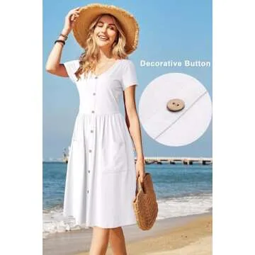 Show moreIf you're looking for a blend of comfort and style this summer, the OUGES Women’s Summer Short Sleeve Midi Dress is your perfect wardrobe addition! Crafted with a super soft and skin-friendly fabric, this dress not only promises breathability but also offers a delightful stretch perfect for those warm spring and summer days. Designed to keep you cool and fashionable, this casual sundress features exquisite details such as decorative buttons that elevate its look without compromising functionality, a flattering v-neck, and two practical front pockets.