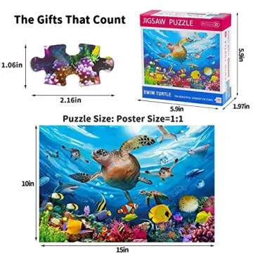 Show more Introducing the captivating Swim Turtle Puzzles—an engaging jigsaw puzzle set designed specifically for young minds. This delightful package includes 100 pieces and a handy 1:1 reference poster to assist children in piecing together the beautiful underwater artwork of a swim turtle. Once completed, the puzzle measures an impressive 15x10 inches (38.2x25.4 cm), making it a stunning display piece for any child's room.