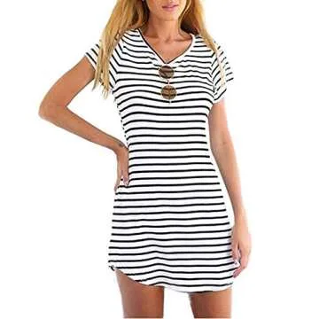 Show moreStep into effortless elegance with the OURS Women's Crew Neck Short Sleeve Striped Loose T-Shirt Mini Dress. This delightful mini dress is crafted from a premium cotton blend that feels incredibly soft against your skin while providing just the right amount of stretch for ultimate comfort. Designed with your convenience and style in mind, its classic black and white stripes offer a timeless appeal that is perfect for any summer occasion. Whether you're dressing down for a day out or looking to make a subtle statement at a cocktail party, this dress has you covered.