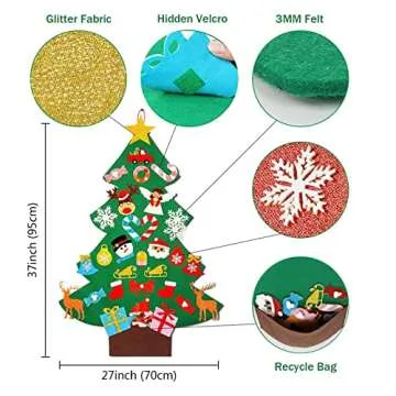 Show moreEmbrace the magic of Christmas with the OurWarm DIY Felt Christmas Tree designed especially for kids! This 3ft charming and innovative felt tree is more than just a decoration; it's a delightful canvas for creativity. Perfectly safe and durable, the tree is constructed from premium quality 3mm thick felt that doesn't emit any harmful odors, making it a healthy choice for children to play with. With 30 detachable glitter ornaments including festive designs such as Christmas stockings, Santa Claus, snowmen, reindeer, snowflakes, and Christmas hats, your little ones can decorate their own tree repeatedly, fostering their imagination and enhancing their creativity.