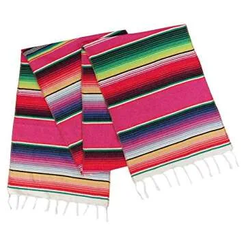 Show more Transform your dining experience and celebrate with vibrant flair using the OurWarm Mexican Table Runner with Tassels. Measuring at a striking 14 inches x 84 inches, this beautifully crafted runner is perfect for adding a festive touch to any gathering. Made from 100% premium cotton, this hand-woven piece features traditional Mexican stripes in a palette of lively colors that inspire an atmosphere of joy and festivity. Its rich material not only enhances the aesthetic but also ensures that it lasts through multiple washes, maintaining its colorful charm over time.