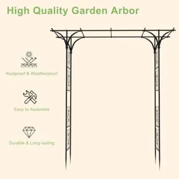 Show more Transform your garden into a beautiful oasis with our stunning garden arch that combines durability and elegance! Crafted from upgraded thickened iron with a rustproof finish, this arch is not just a visual delight but also built to withstand the elements. Spanning an impressive 71 inches in length, 15 inches in width, and reaching a magnificent 87 inches in height, it serves as a perfect backdrop for your climbing vines and flowers.