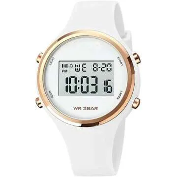 Show moreDesigned with a blend of functionality and style, this imported Ladies' Watch showcases an elegant simplicity that complements its precision and utility. Equipped with Japanese quartz movement, it maintains impeccable timing, crucial for both daily tasks and sports activities. The large dial features a clear, easy-to-read LED backlit display useful in both daylight and darker environments, ensuring that time is always accessible.