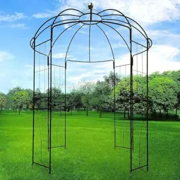 Show more Immerse yourself in the beauty and elegance of our stunning birdcage gazebo, a perfect addition to any garden or outdoor space. Crafted by a renowned brand known for durability and innovation, this gazebo features a unique birdcage shape that not only serves as an enchanting focal point but also provides structure for climbing vines such as ivy, clematis, and wisteria to ascend naturally towards the sky. With its four impressive tall side panels and an overall height of 106 inches, it stands tall and proud in your yard, inviting admiration from all who pass by.