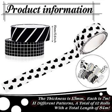 Show moreUnleash your creativity with the Outus 12 Rolls Washi Tape Set, an exceptional collection of decorative masking tapes designed to enhance your craft projects. This set includes 12 unique rolls, each measuring 15 mm (0.58 inch) wide and 7 meters (7.66 yards) long, offering an abundance of possibilities for your artistic ventures. The tapes are crafted from high-quality washi paper that effortlessly combines functionality and beauty, making them perfect companions for any creative activity. With a selection of vibrant styles—including hearts, plants, squares, and leopard prints—you can personalize your office space, scrapbook pages, or DIY gifts with ease and flair.