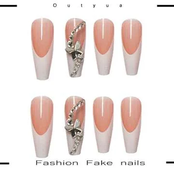 Outyua French Designer Press on Nails Coffin Glossy Butterfly Rhinstone Extra Long False Nails with Design Acrylic Full Cover Artificial Nails for Women and Girls 24pcs