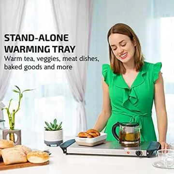 Its precise heat setting allows you to customize the temperature based on your preferences, ensuring your food remains perfectly warm for hours. The tray cycles on and off to maintain the specified heat range, preventing any risk of overheating. You won’t have to worry about overcooked sides or chilly appetizers ever again!