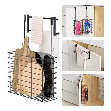 Show moreTransform your kitchen storage with the Over the Cabinet Door Organizer, a multifunctional solution designed to maximize space while keeping your cutting boards and kitchen essentials within easy reach. Crafted with a durable steel wire frame, this cabinet organizer not only looks sleek but also promises long-lasting performance. The basket is perfectly sized to fit cutting boards, baking pans, cookie sheets, and even plastic food wrap. Plus, with two towel bars on the exterior, you can elegantly hang kitchen towels or washcloths, further helping reduce counter clutter and enhance your kitchen's functionality.