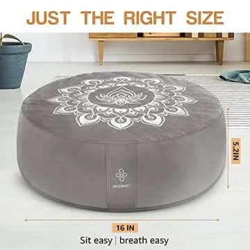 Show more Transform your meditation practice with the Overmont Meditation Cushion, a beautifully designed and functional accessory made to elevate your comfort and enhance your experience. Sized at 16 inches by 16 inches with a height of 5.2 inches, this large meditation cushion is perfect for helping you achieve the right posture while sitting on the floor. There’s no need to deal with discomfort or stiffness in your hips – our innovative design allows your legs to rest comfortably beneath your elevated pelvis, significantly reducing pressure on your hip joints. Crafted with 100% natural buckwheat hulls that have been meticulously cleaned and processed, this cushion features a breathable structure that promotes airflow, helps you maintain alignment, and ensures long-lasting durability.