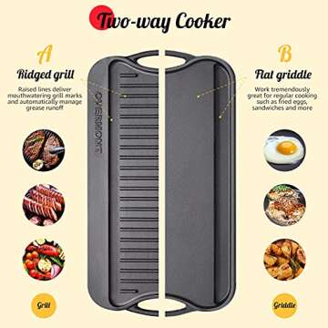 Unlike many other grill pans on the market, Overmont’s 2-in-1 reversible griddle distinguishes itself through its two cooking surfaces, pre-seasoned readiness, and heavy-duty construction. Competitors often lack the dual functionality or require extensive seasoning before first use. Overmont's pre-seasoning provides immediate usability, catering to busy cooks who want to get started right away.