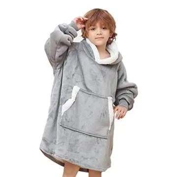 Oversized Blanket Hoodie for Kids Flannel Sherpa Wearable Sweatshirt Blanket Snuggies Warm Plush Hooded Blanket with Huge Pocket and Elastic Sleeve Light Grey