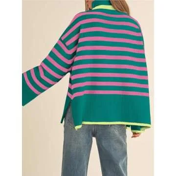 Oversized Sweaters for Women Fall Turtleneck Pullover Striped Green Pink 2X