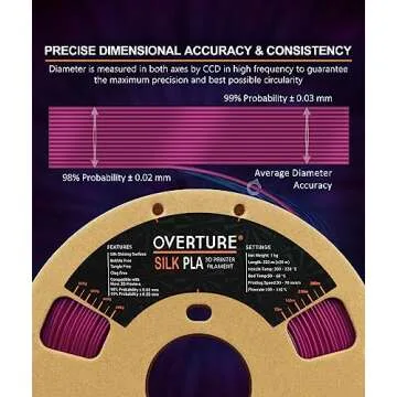 The Overture Silk PLA filament stands out in the highly competitive market of 3D printing materials. It is designed with innovative features, ensuring a clog-free and bubble-free experience. Our patented clog-free formula means you can print continuously without interruptions, while our rigorous drying process and vacuum-sealed packaging preserve the filament's quality for every print job. Each spool is meticulously wound and inspected to eliminate tangling, allowing for a smooth and hassle-free feeding during your high-speed printing tasks.