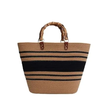 OWGSEE Straw Beach Bag, Straw Tote Bag for Women with Bamboo Handles Summer Vacation Woven Beach Bag Shoulder Handbag (Khaki)