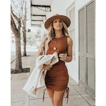 The side drawstring feature allows for adjustable length and fit, enabling you to customize the look to your preference. With a timeless crew neck and sleeveless design, this dress offers versatility for layering with jackets or wearing alone for a sleek summer look. The rich browns of this dress ensure you are always on-trend, perfectly complementing a variety of accessories.