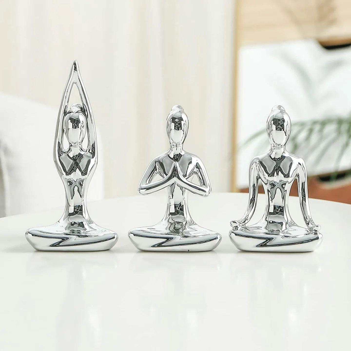 Immerse yourself in tranquility and balance with this exquisite set of yoga statues, meticulously crafted from high-quality ceramic and adorned with an elegant silver plating. Each statue, measuring between 3.3" to 4.3" in height, vividly captures the essence of serenity through its classic yoga postures. This set includes three distinct pieces, each representing a different yoga pose, making it a versatile and appealing addition to any collection.