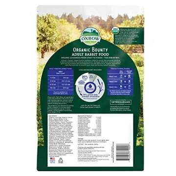 Show moreElevate your rabbit’s dining experience with the Oxbow Animal Health Organic Bounty Adult Rabbit Food. Specially crafted for adult rabbits, this delicious blend of pellets is not just food—it's a celebration of nature’s bounty! Each pellet is made from 100% hand-selected, certified organic meadow hay, ensuring every bite brings delight and nourishment. Designed to satisfy even the pickiest eaters, this premium rabbit food promotes health and happiness from the inside out.