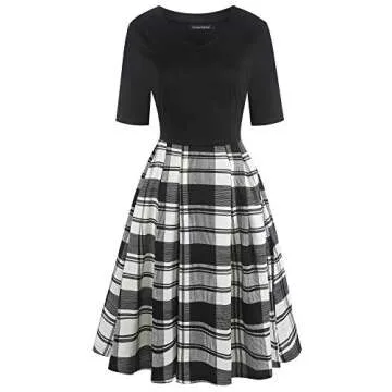 Show moreStep into style and sophistication with the oxiuly Women's Classic Plaid Knee-Length Vintage Work Dress. Expertly designed with a modern twist on a vintage silhouette, this elegant V-neck cocktail party swing dress combines versatile fashion and functional design. Crafted from high-quality stretchy velvet material, it gracefully hugs your curves while ensuring ultimate comfort whether you're heading out for a formal event or a casual day with friends. The slightly above-the-knee hemline offers the perfect modest touch without sacrificing chicness, making it a staple in your wardrobe.