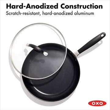Show moreExperience the ultimate in cooking convenience with the OXO Good Grips 12" Frying Pan Skillet with Lid. This expertly crafted skillet combines modern design with exceptional functionality, making it a must-have kitchen tool for both novice and experienced chefs alike. Featuring a durable hard-anodized body, this frying pan ensures optimal heat conduction and outstanding resistance to scratching, while the three-layer German-engineered non-stick coating enables effortless food release with less oil. Not only does this mean healthier meals, but it also allows for easy clean-up, adding to your cooking enjoyment.