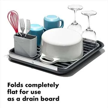 OXO Good Grips Aluminum Fold Flat Dish Drying Rack, 2-Tier, with Drainboard, for Kitchen Counter, Collapsible