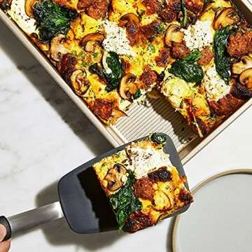 Efficiency is key in any kitchen, and that’s why the OXO cake pan features visible size markings on its surface – perfect for quick identification when you’re in the midst of a baking frenzy. It’s not just splendid for sheet cakes; this versatile pan is ideal for a range of baked treats including rectangular loaves.