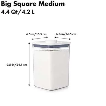 Built with a user-friendly push-button mechanism, opening and sealing these containers is a breeze. The push button also doubles as an easy-to-grip handle for effortless lid removal. When it's time for cleaning, simply place them on the top rack of your dishwasher—a feature that represents the remarkable quality of the OXO Good Grips brand. With dimensions of 6.5" x 6.5" x 9.5", these containers fit snugly in pantry shelves while also conveniently stacking together with other POP containers for a perfectly organized storage solution.