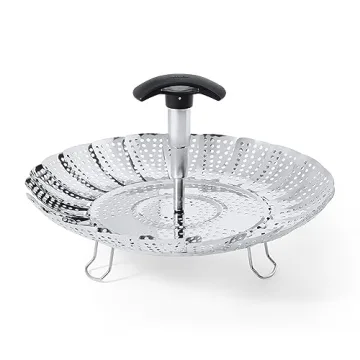 Show moreIntroducing the OXO Good Grips Stainless Steel Steamer with Extendable Handle, an essential kitchen companion for health-conscious cooking enthusiasts. This innovative steamer is meticulously crafted to elevate your culinary game, offering functionality and ease of use that the modern chef desires. Its removable handle extends and locks into place for secure transportation and filling, while seamlessly retracting to fit pot lids above steaming food. Designed to accommodate pots with a diameter of 8 inches or more, this steamer ensures your vegetables, seafood, and other dishes are perfectly elevated above boiling water, thanks to its robust 1 3/4-inch feet that fold flat for easy storage.