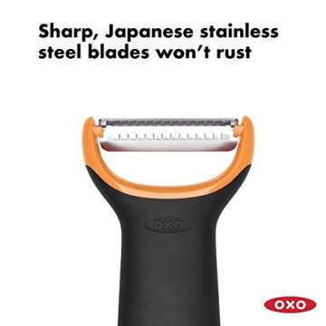 Show moreIntroducing the OXO Good Grips Julienne Prep Peeler, a kitchen tool that makes preparing fresh veggies a breeze! Designed with the user in mind, this peeler features a compact Y-peeler shape that allows for effortless maneuvering, catering to a variety of hand grips. Whether peeling carrots, cucumbers, or zucchini, you can achieve perfect strips every time. Constructed with sharp, durable Japanese stainless steel blades, this peeler promises precise and consistent results without the worry of rust. The non-slip ergonomic handle ensures comfort while working, making it ideal for extended kitchen sessions.