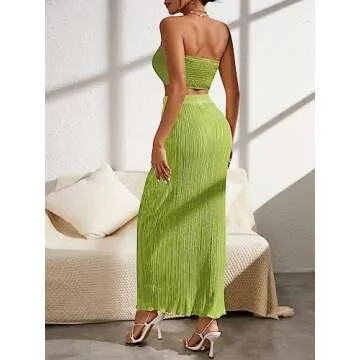 Show moreIntroducing the **OYOANGLE Women's 2 Piece Outfits** - a stylish and contemporary set that combines comfort and sophistication for any occasion. This versatile ensemble features a beautiful off-shoulder design complemented by a shirred back and a fashionable drawstring to enhance your silhouette. The ruched front crop tube top paired with a chic plisse skirt creates an effortlessly elegant look that's perfect for both formal events and casual outings. Made from a soft, comfortable fabric that is gentle on your skin, this outfit ensures you feel as fabulous as you look, no matter where you go.