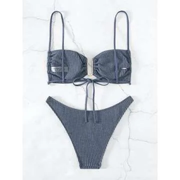OYOANGLE Women's 2 Pieces Spaghetti Strap Ring Linked Ribbed High Cut Bikini Swimsuit Bathing Suit Dusty Blue XS