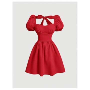 OYOANGLE Women's Cute Bowknot Short Puff Sleeve A Line Short Dress Square Neck Party Cocktail Dresses Red Medium