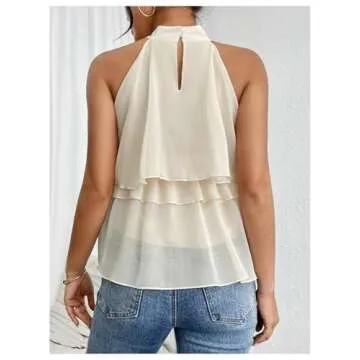 Show moreExperience the perfect blend of style and comfort with the OYOANGLE Women's Layered Ruffle Hem Sleeveless Halter Chiffon Blouse. Crafted from lightweight, breathable fabric, this flowy blouse top is designed to keep you feeling cool and comfortable while making a fashion statement. The unique tiered layered structure provides a flattering silhouette, while the ruffle hem adds a touch of femininity to any outfit. Featuring a keyhole back design, this sleeveless blouse is perfect for those warm summer days or casual outings.
