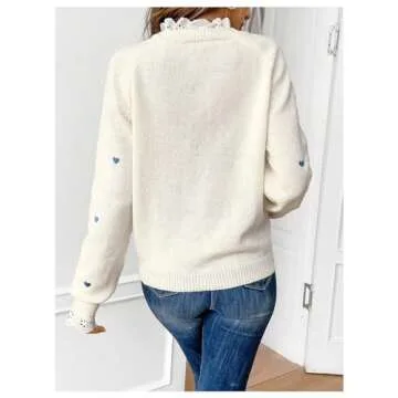 OYOANGLE Women's Long Sleeve Sweater Heart Embroidery Crewneck Lace Patchwork Pullover Sweaters Casual Knitted Tops White Medium