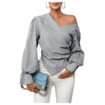 OYOANGLE Women's Ruched Striped Asymmetrical Neck Blouse Lantern Long Sleeve Hanky Hem Office Shirt Tops Black Small