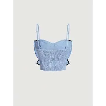 Show moreElevate your summer wardrobe with the stunning OYOANGLE Women's Solid Bowknot Front Ruched Cami Top. This delightful baby blue crop top is crafted from a soft fabric that feels gentle against your skin, making it an essential piece for any sunny outing. Designed with a trendy cropped length and stylish spaghetti straps, it's not only a fashionable choice but also offers effortless comfort for your daily wear. The standout feature is the chic big bowknot decor, combined with eye-catching contrast binding that adds a touch of sophistication. Get ready to make a statement wherever you go!