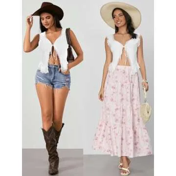 Design: Contrast lace, v neck, tie front, open front, asymmetrical hem, sleeveless, fashionable
